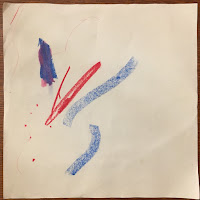 Mark making at this stage is characterized by exploration of the tools. Marks appear random and varied, often with a weak line quality. Sometimes there is evidence of the actions that make the marks such as dots that indicate tapping on the paper. Other times there are heavy marks that indicate greater pressure or explorations of using the side of a crayon.