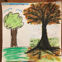 The tree drawings below show the continued transition from the schema for natural objects, “m” birds and lollipop tree to a more naturalistic view of a tree with branches and roots and shading for the colors of the leaves.