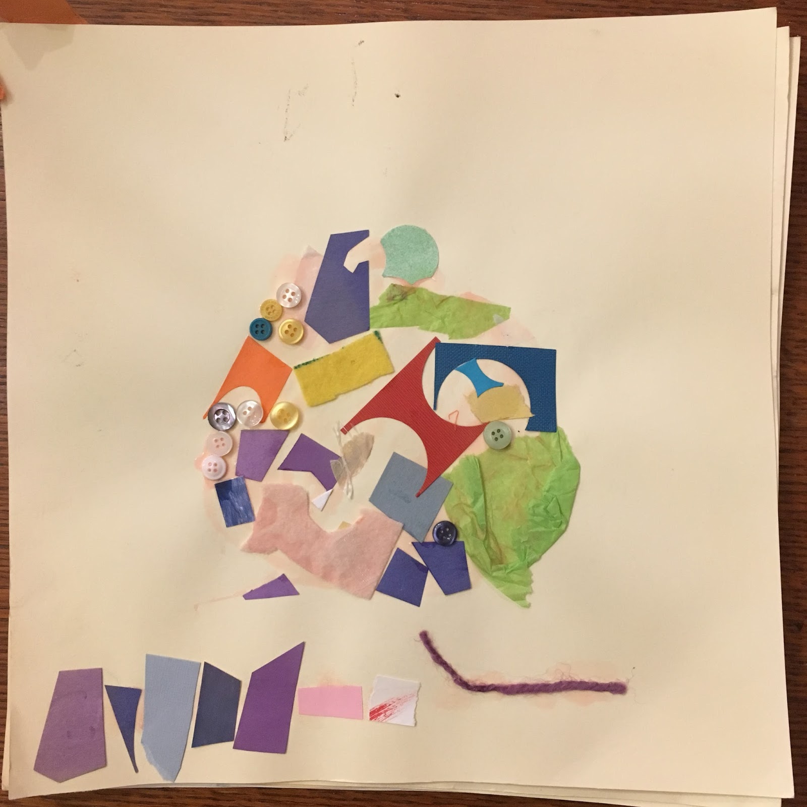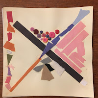 For collage, design stage work similarly focuses on how the space is organized and sectioned on the page. Often geometric shapes divide the space and materials may be sorted into areas such as buttons in one place, felt in another and pink strips in yet another. Again, it can be interesting to hear the child’s story with their creations as the designs often have much more intention and interest than may be evident from just viewing the work.