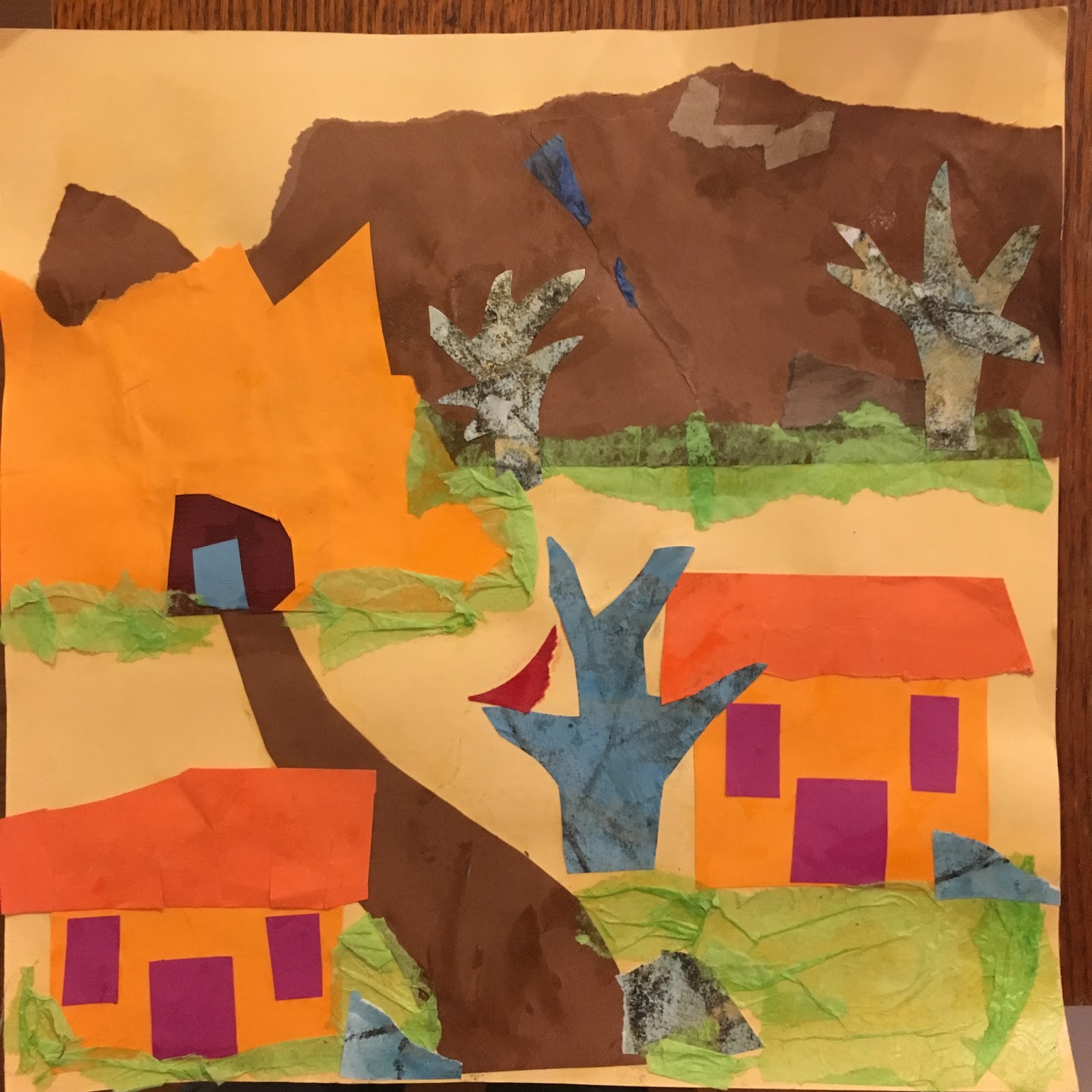 This second collage shows how collage work can progress from simple flat representation to something that shows texture, layering and depth in an image. The chance to explore open-ended materials allows the creator to enter into conversation with the materials and explore and discover along the way, ultimately creating more complex images and designs.