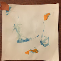 In collage work, exploration is again a time of getting to know the materials. In the collage on the left, a bit of coloring in the glue allows the child to see where the glue is applied on the paper. Here the glue is applied with the brush and spread like paint. Scraps stuck down appear random and some glue is left just as marks on the paper. There is a good chance that a child may try to remove the pieces once this is dry, again testing the materials and what they will do.